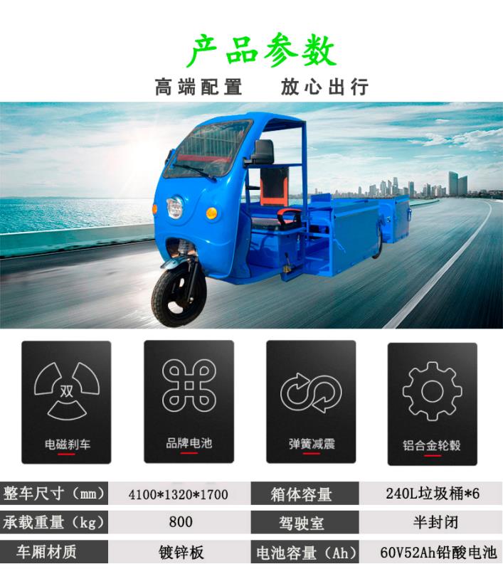 產(chǎn)品簡介:ZT6-3;可拉六桶垃圾,每個桶容積 240L。整車尺寸4100*1320*1700mm,承載重量800kg,車廂材質(zhì)2.0mm 鍍鋅板,主梁 2.5mm 加厚碳鋼,液壓加粗減震前叉,車架電池盒,鉛酸電池,60v52超威免維護電池,電壓60V,側(cè)門及后門可…