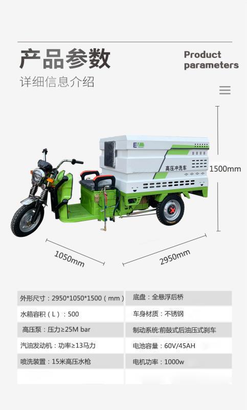產(chǎn)品簡介:QX500-1;整車尺寸:2950*1050*1500mm,水箱容積:500L;電機功率:1000w,自帶15米高壓水槍
