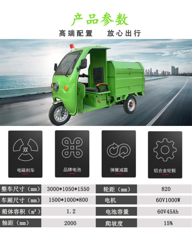 產(chǎn)品簡(jiǎn)介:型號(hào):QY3-1;額定成員:1人;整車(chē)尺寸:3000*1050*1550(mm);車(chē)廂尺寸:1500*1000*800(mm);后輪距:820 mm;軸距:2000 mm,箱體容積:1.2立方;電池:60V45Ah超威牌免維護(hù)高效鉛酸電池