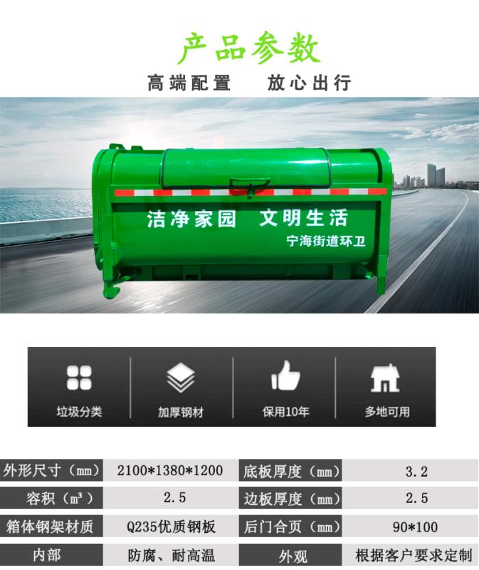 產(chǎn)品簡(jiǎn)介:垃圾箱容積:2.5立方,外形尺寸:2100mm*1380mm*1200mm,箱體鋼板厚度:底板3.2mm,邊板2.5mm,箱體鋼架采用Q235材料:材料厚度底3.2mm、邊2.5mm
