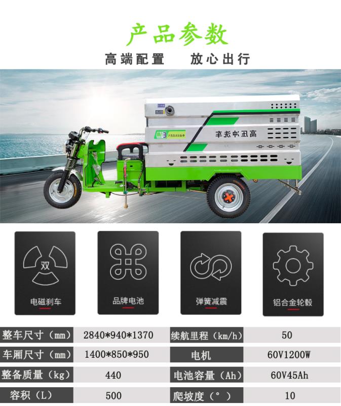 產(chǎn)品簡介:整車尺寸(mm):2840*940*1370;車廂尺寸(mm):1400*850*950;容積:500L;15米高壓水管,燈光及信號(hào):組合前燈、轉(zhuǎn)向燈、組合尾燈、電喇叭及倒車蜂鳴器